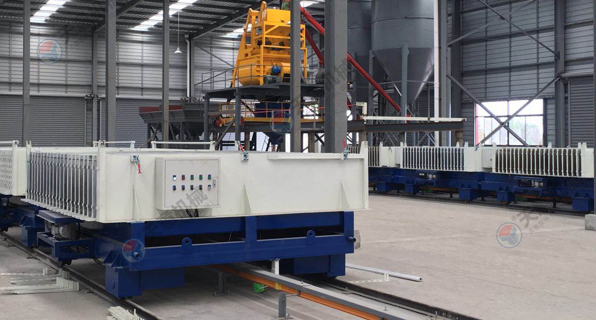 TY20型輕質墻板生產線包括:墻板成型機、整體穿抽管系統、發泡系統、水箱、電子計量儲料倉、螺旋上料輸送機、儲料罐、螺旋輸送機、EPS熟化料倉、硫化干燥床、EPS預發機、數控配電室、發泡攪拌機、整體出板系統、叉車、成品堆放區、擺渡車。